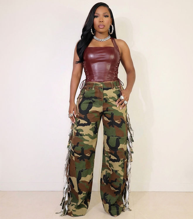 • Women Camouflage Tassel Pocket Button Camouflage Pants