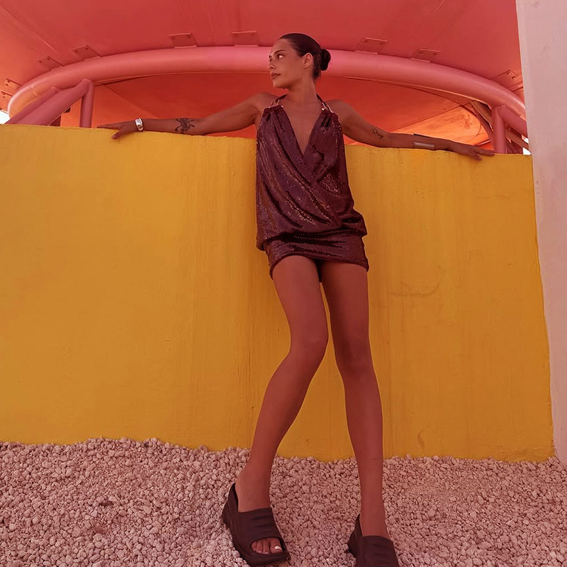 Women Spring Sexy V-Neck Sequined Hardware Buckle Neck Dress